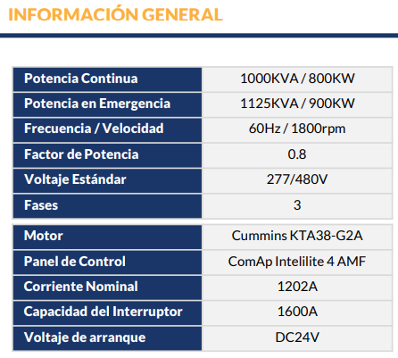 Potencia 1125 KVA en Standby (modo de operación en emergencia) 220/127 Volts @60 Hz , motor Cummins diesel, generador Leroy Somer, panel de control ComAp o similar, con cabina insonorizada, cargador de baterías inteligente 24 volts